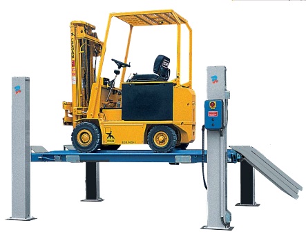 Подъёмник четырехстоечный электромеханический с гладкими платформами для вилочных погрузчиков.