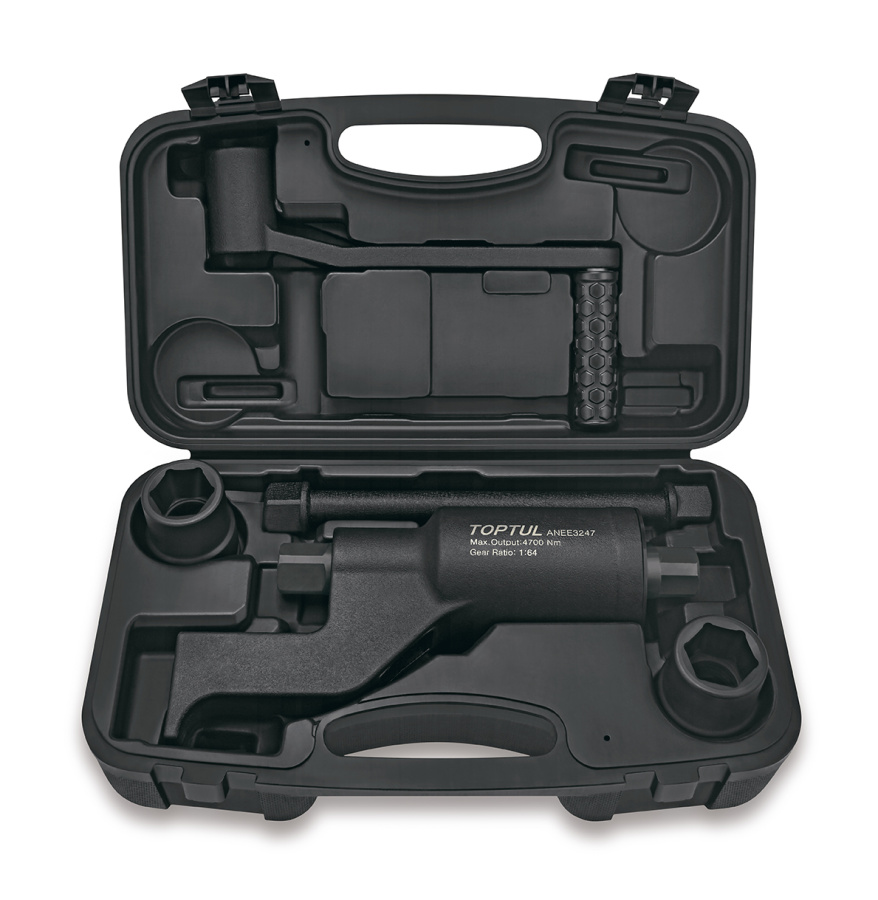 Комплект включает в себя один мультипликатор крутящего момента, рукоятку кривошипа, удлинитель и две боковые тонкостенные ударные головки 6PT (32 и 33 мм)
